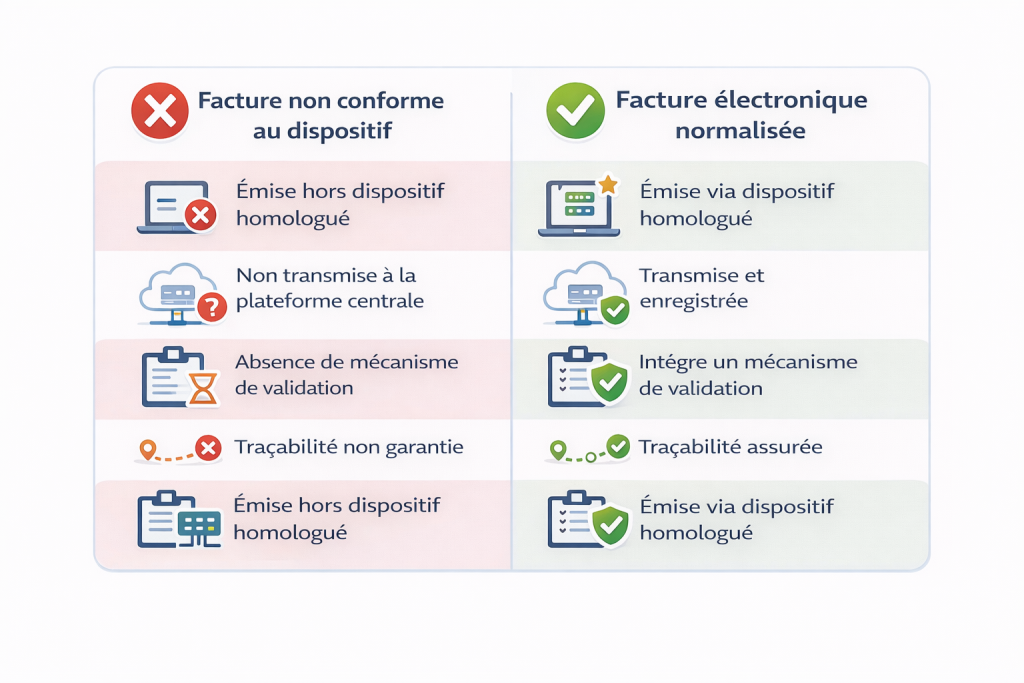 Une facture électronique normalisée se distingue par son mode d’émission et de validation via le dispositif E-Fact qui aboutit à un QR code présent sur la facture.